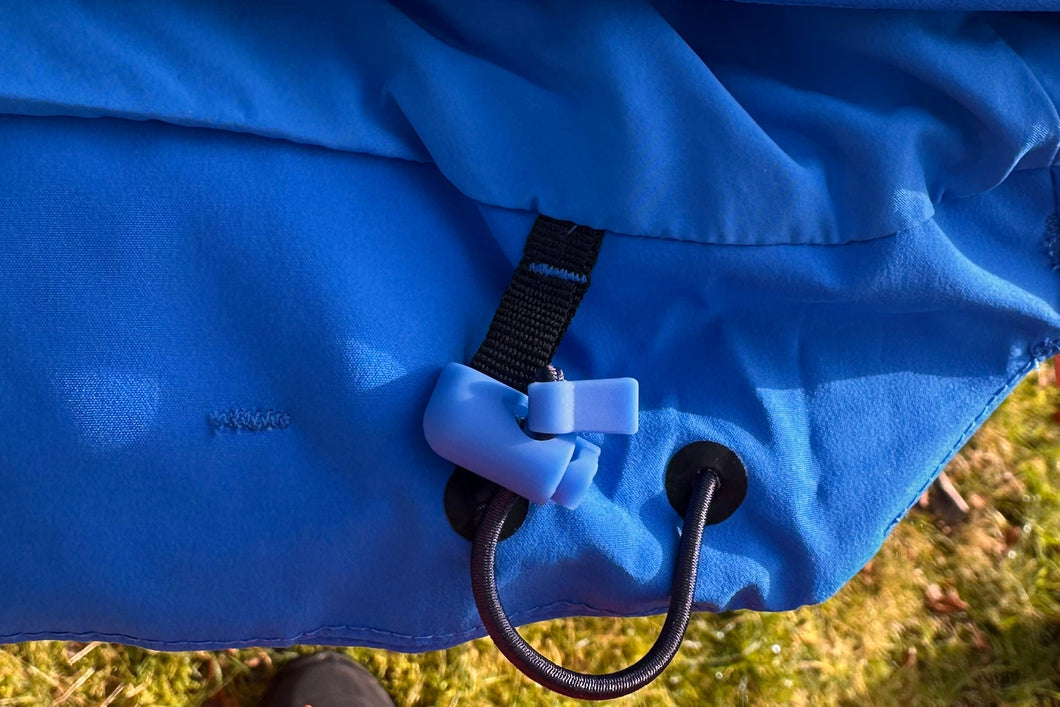 The adjustable fixed hood and cord-adjustable hem allow for adaptation to various conditions.