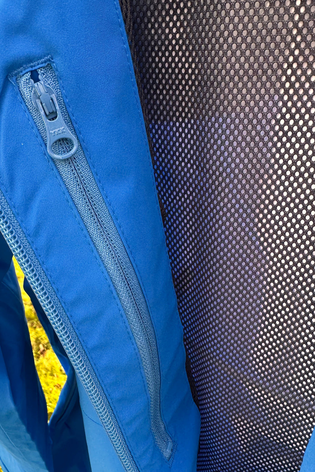 For enhanced comfort, the jacket includes zippered under arm ventilation openings ("pit zips").